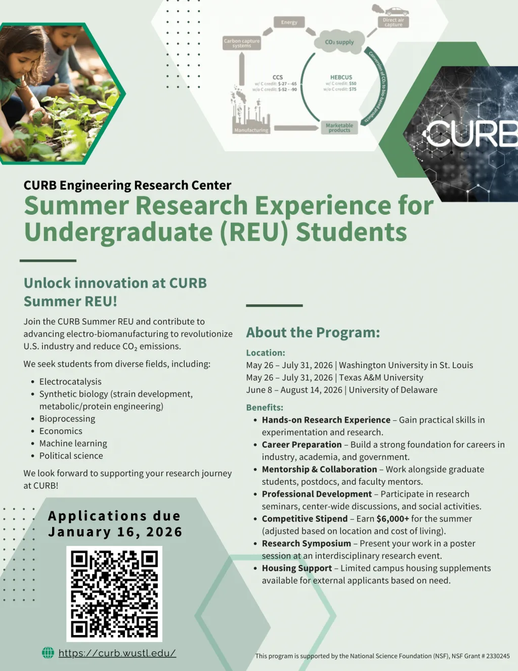 Join the CURB Research Experiences for Undergraduates (REU) program, which aims to advance electro-biomanufacturing technologies that will revolutionize U.S. industry and reduce CO2 emissions.