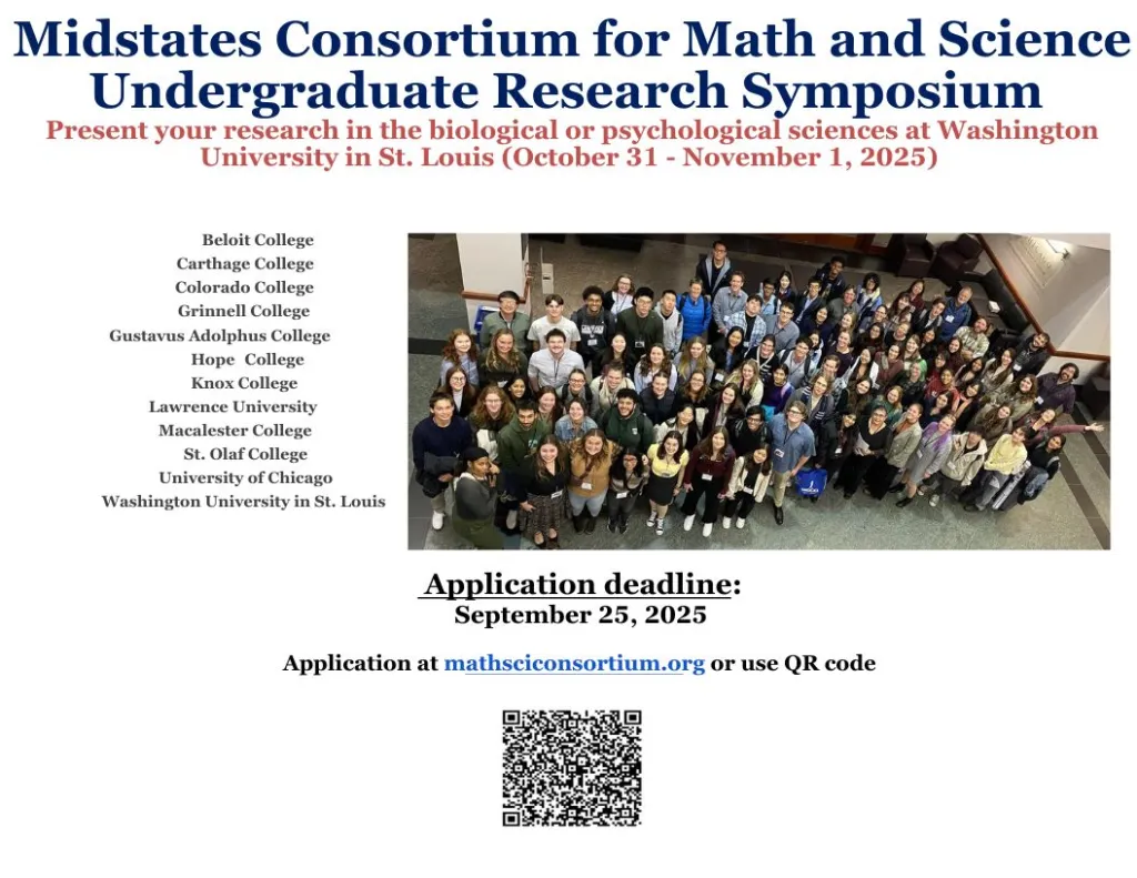 The Mid-States Consortium for Math and Science: Biological and Psychological Sciences Undergraduate Research Symposium will be held at the Washington University in St. Louis on October 31 - November 1, 2025. Details can be found at https://www.mathsciconsortium.org/ and on the application page.