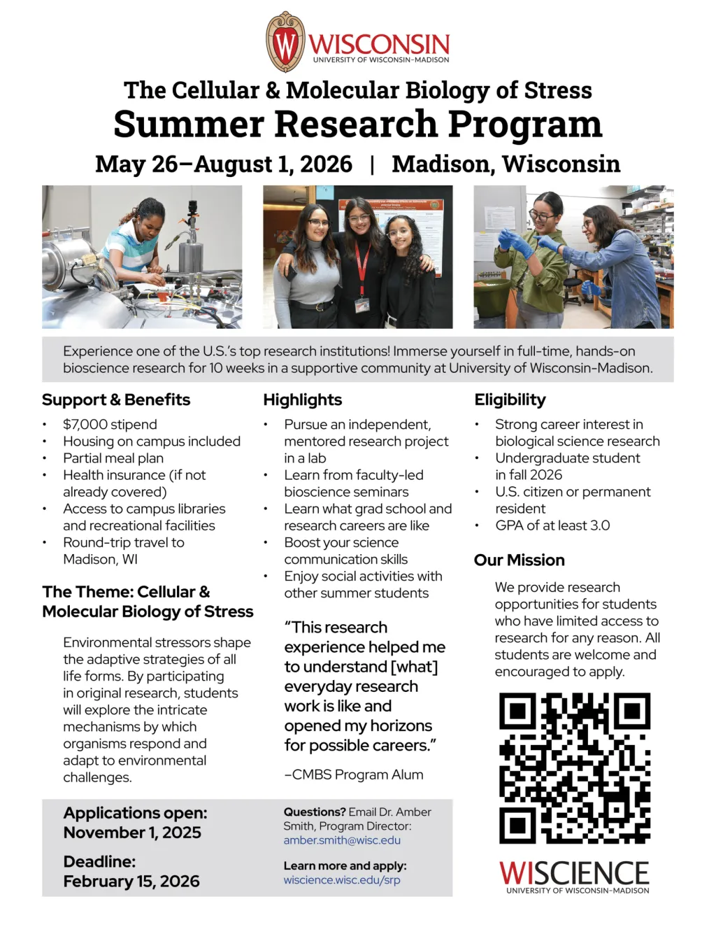 The University of Wisconsin-Madison Cellular and Molecular Biology of Stress Summer Research Program is now accepting applications for Summer 2026! They are looking for undergraduate students who are interested in an immersive, 10-week faculty-led research experience to prepare for their graduate education and research career. Students will engage in research to explore the intricate mechanisms by which organisms respond and adapt to environmental challenges. They have a wide array of projects across scales of research from molecular to ecological work.